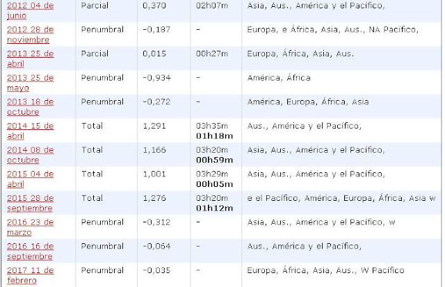 3. Total – Toda la Luna pasa a través de la sombra umbral de la Tierra. La Luna puede a su vez de color naranja, rojo o marrón oscuro.