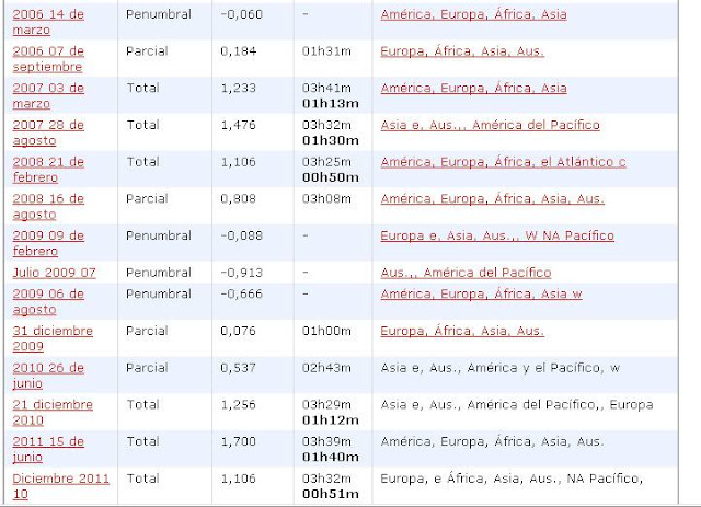 La siguiente tabla muestra cada eclipse lunar (incluyendo penumbral) desde 2001 hasta 2020. Haga clic en el eclipse de la fecha para ver un mapa y el diagrama de un eclipse. La Magnitud Umbral es la fracción en el diámetro de la Luna inmersa en el cono de sombra al máximo eclipse. Para magnitudes superiores a 1,0, el eclipse es total. Para los valores negativos, se trata de un eclipse penumbral. La duración del eclipse es la duración de las fases parciales, así como la fase de totalidad (en negrita; eclipses totales solamente). La región geográfica de Eclipse Visibilidad ofrece una breve descripción del lugar un eclipse puede ser visto. Aunque los eclipses lunares son penumbral incluido en esta lista, por lo general son difíciles de ver porque son débiles.