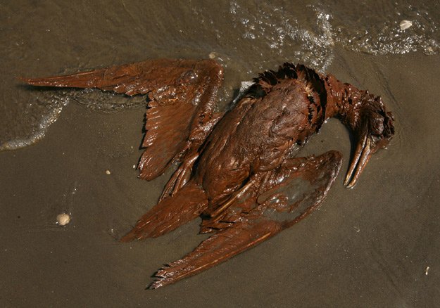 Un alcatraz muerto cubierto de petróleo se encuentra a lo largo de Grand Isle Beach en Grand Isle, Louisiana 21 de mayo 2010. Un miembro del Tri-Estatal de Rescate de Aves y la Investigación ‘a la mancha del lugar del incidente. (REUTERS / Sean Gardner)