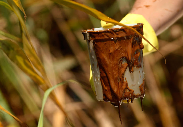 El petróleo, recogió con un cubo en el Golfo de México del lado del suministro de los vasos Griffin Joe, abrigos de las manos de un reportero de la AP en el sitio del derrame de petróleo en aguas profundas Horizon en el Golfo de México, 10 de mayo de 2010. (Foto AP / Gerald Herbert)