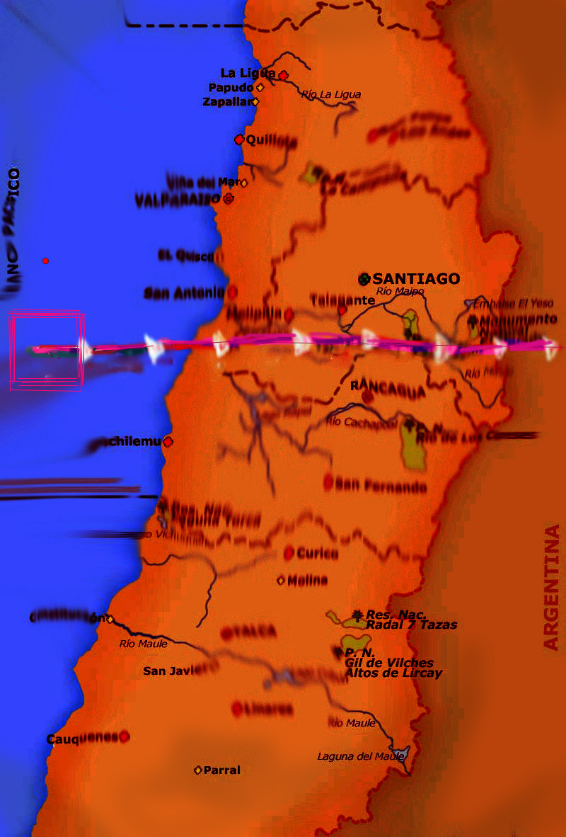 El epicentro del terremoto era en la costa de Chile. Vi a Santiago de Chile. Vi una linea roja con flechas blancas que corría desde el mar por la parte sur de Santiago al este al país que es vecino de Chile. Vi un cuadrado(que presentaba el epicentro) de 14.0 magnitud en la costa de Chile.