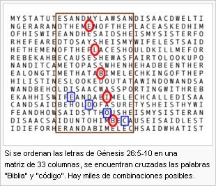 El código fue descubierto en la versión hebrea del Antiguo Testamento (Torah), eliminando los espacios entre palabras, y convirtiendo el texto en una única hebra de 304.805 letras. La computadora explora esta larga tira en busca de las palabras y frases que se le ingresan al programa. Comienza con la primera letra, primero de corrido, luego saltando de a una letra, luego de a dos, y así sucesivamente hasta terminar. Seguidamente, rehace el mismo proceso comenzando desde la segunda letra, y luego desde las demás hasta terminar. Esto se denomina ELS(Equidistant Letter Sequences) que significa “secuencias de letras equidistantes”, que luego se reordena para presentarlo como matriz o crucigrama, al igual que aparece en el dibujo del encabezado de la página.Conviene hacer una importante aclaración: el código descubierto ha sido confirmado por matemáticos no creyentes y especialistas en codificación del pentágono, además de haber sido probado en otros textos, comprobándose que sólo en la Biblia se da éste fenómeno.El código narra hechos que sucedieron mucho después de que fuera escrita la Biblia. Se indican nombres completos, fechas, lugares y otras características sobresalientes de cada uno de los sucesos.Algunos de los sucesos que narra el texto oculto son:- “Shakespeare”, “llevó a escena”, “Macbeth”, “Hamlet”- “Asesinato de Rabin”, “Amir”(nombre del asesino del primer ministro israelí), “Tel-Aviv”, “En 5.756” (Año judío equivalente a 1.995-1.996).- “Hitler”, “hombre malvado”, “nazi y enemigo”, “matanza”- “Edison”, “electricidad”, “bombilla” -“Hermanos Wright”, “aeroplano”- “Newton”, “gravedad” -“Clinton”, “presidente”- “Fue hecho por ordenador”, “la escritura grabada en las tablas”- Incluso se hace una pequeña alusión a Francisco