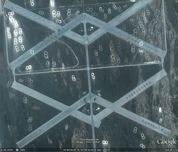 La idea de la alta ganancia, el corte de los bordes de estas antenas, apuntando hacia la ionosfera, parece dar a entender que esta instalación está diseñada para un propósito similar a la instalación HAARP de Alaska. No es una exageración. China tiene numerosas y sorprendentes cosas que pueden verse al estudiar Google Earth. Existen ciudades — enormes y tan modernas que ellos parecen salido de Star Trek — que están todas vacías y lejanas de cualquier otra civilización. Hay miles de millas cuadradas de generadores eólicos, y patrones extraños en su Área-51 que fue informado hace algún tiempo.