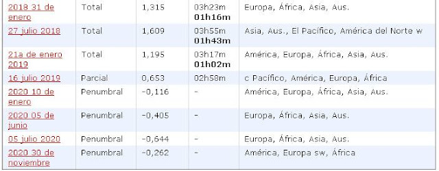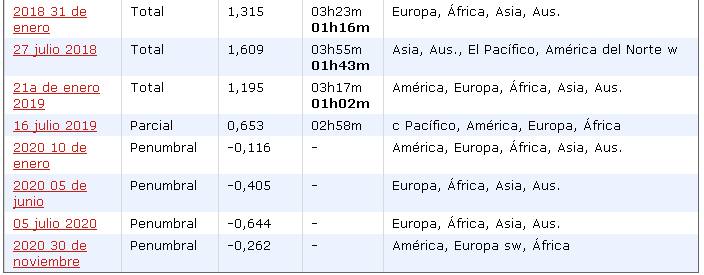 La siguiente tabla muestra cada eclipse lunar (incluyendo penumbral) desde 2001 hasta 2020. Haga clic en el eclipse de la fecha para ver un mapa y el diagrama de un eclipse. La Magnitud Umbral es la fracción en el diámetro de la Luna inmersa en el cono de sombra al máximo eclipse. Para magnitudes superiores a 1,0, el eclipse es total. Para los valores negativos, se trata de un eclipse penumbral. La duración del eclipse es la duración de las fases parciales, así como la fase de totalidad (en negrita; eclipses totales solamente). La región geográfica de Eclipse Visibilidad ofrece una breve descripción del lugar un eclipse puede ser visto. Aunque los eclipses lunares son penumbral incluido en esta lista, por lo general son difíciles de ver porque son débiles.