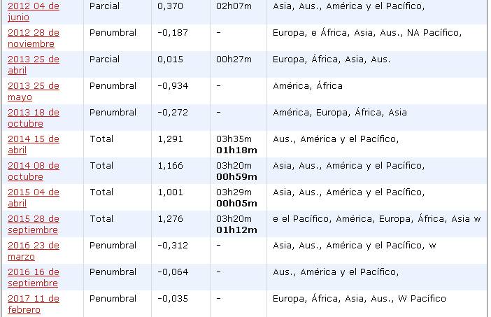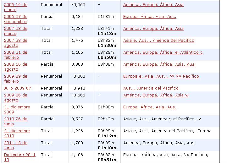 La siguiente tabla muestra cada eclipse lunar (incluyendo penumbral) desde 2001 hasta 2020. Haga clic en el eclipse de la fecha para ver un mapa y el diagrama de un eclipse. La Magnitud Umbral es la fracción en el diámetro de la Luna inmersa en el cono de sombra al máximo eclipse. Para magnitudes superiores a 1,0, el eclipse es total. Para los valores negativos, se trata de un eclipse penumbral. La duración del eclipse es la duración de las fases parciales, así como la fase de totalidad (en negrita; eclipses totales solamente). La región geográfica de Eclipse Visibilidad ofrece una breve descripción del lugar un eclipse puede ser visto. Aunque los eclipses lunares son penumbral incluido en esta lista, por lo general son difíciles de ver porque son débiles.