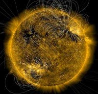 Esta nueva imagen del Sol fue obtenida el pasado 20 de agosto mediante un instrumento para obtener imágenes heliosísmicas magnéticas (HMI) con el que está equipado la sonda SDO. Las líneas de campo magnético están codificadas por colores: las blancas muestran los campos magnéticos que están cerrados -es decir, que no sueltan viento solar- y las líneas doradas los campos abiertos, aquellos que sí lo dejan escapar. Para los científicos, la comprensión de este mecanismo resulta muy importante, ya que creen que las tormentas solares están provocadas por los cambios en la estructura y las conexiones de estos campos.