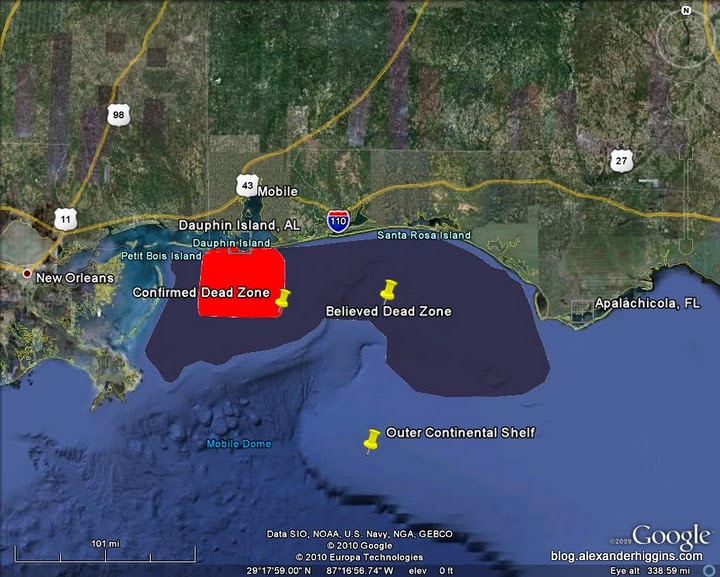 Los investigadores midieron los niveles de oxígeno bajos a lo largo del tramo de 40 millas alrededor de la muestra que toda la isla de Dauphin, en Alabama, de alrededor de 40 millas de la costa a menos de una milla o dos de la costa. La capa inferior de agua fue reducida en oxígeno a una profundidad de unos 30 metros cerca de la costa a 100 metros más hacia fuera, a lo largo de la plataforma continental – un borde de aguas poco profundas trazado de la costa de Mississippi a Florida.