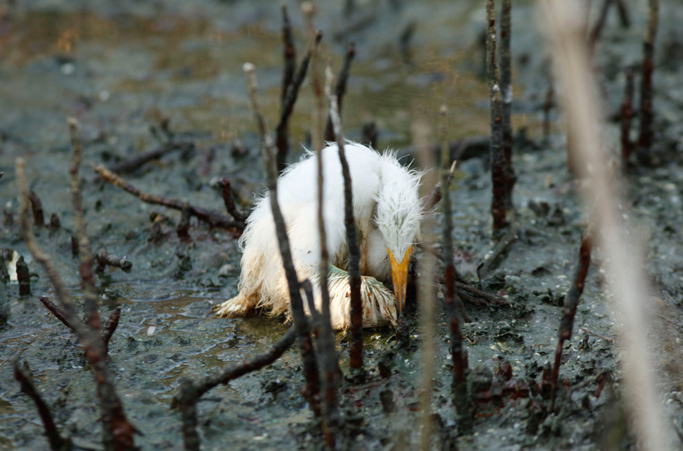 Una garza joven se sienta morir en medio de salpicaduras de aceite por debajo de los manglares en una isla afectados por el petróleo del derrame de petróleo en aguas profundas Horizon en la bahía de Barataria, a lo largo de la costa de Louisiana el Domingo, 23 de mayo 2010. (Foto AP / Gerald Herbert)