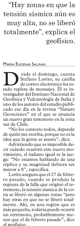 primero ke nada no se quien eres pero te aseguro ke eres una persona extremadamente descuidada al atreverte a publicar que vendra otro terremoto para chile en marxo del 2011, yo soy chileno, vivo en la octaba region, donde fue el epicentro y te aseguro que si algo asi llegara a hacerse publico causarias una histeria colectiva, tu no viste todo lo que paso, familias enteras murieron, mascotas abandonadas, gente herida, fue horrible.